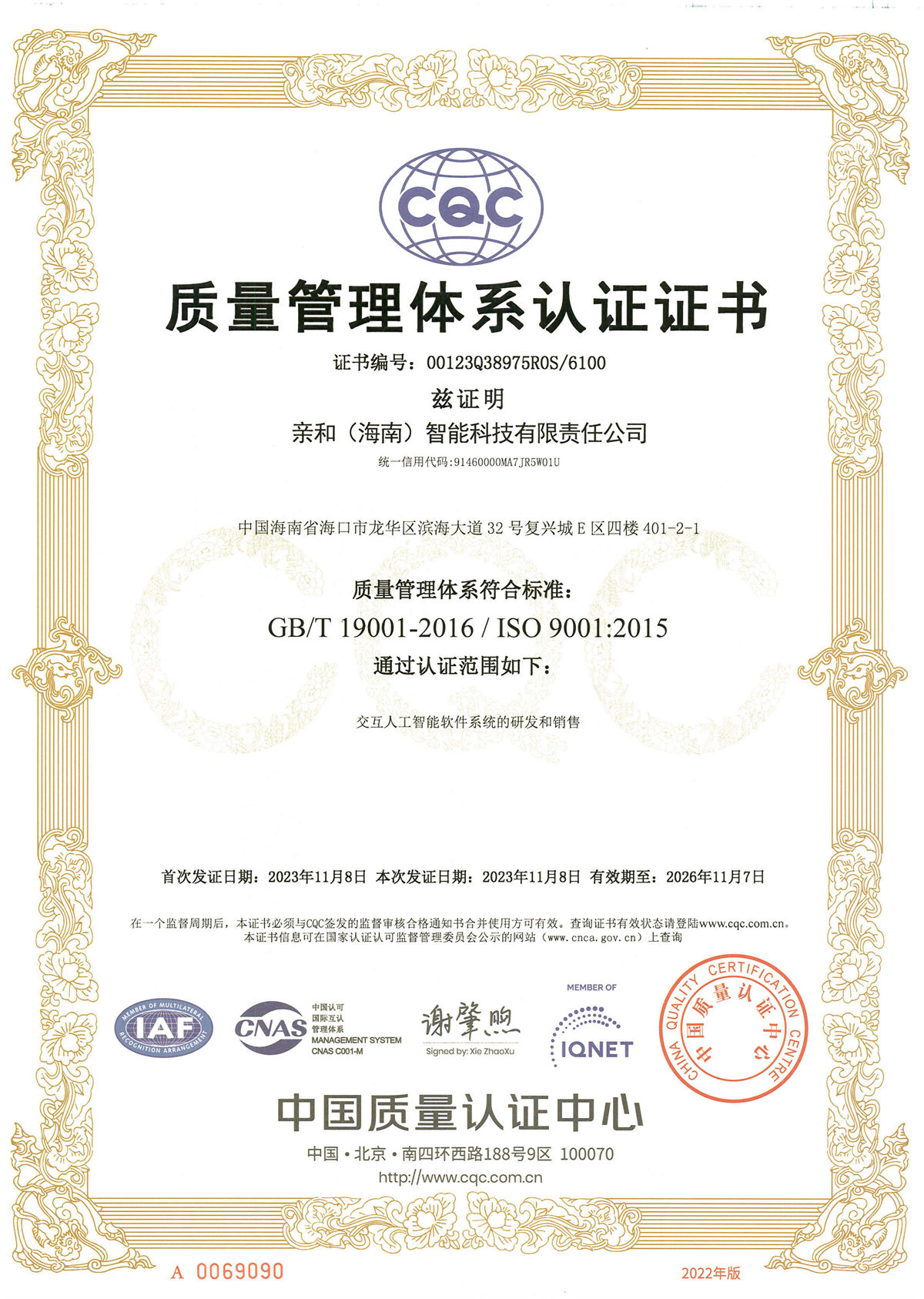 2023年11月8日,亲和智能顺利通过ISO9001质量管理体系认证审核,成功取得GB/T19001-2016/ISO9001:2015质量管理体系认证证书。